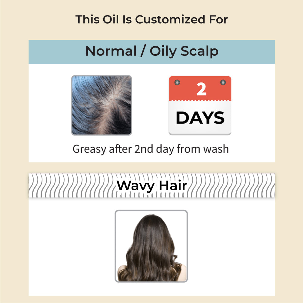 CUSTOMIZED AYURVEDIC HAIR FALL OIL FOR NORMAL-OILY SCALP AND WAVY/CURLY HAIR: Decreases hair fall and restore natural oils on your scalp with this hair oil, specially formulated for normal-oily scalp and wavy hair. Balances the natural pH of the scalp.